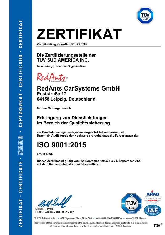RedAnts CarSystems GmbH ist TÜV Süd zertifiziert für den Bereich Dienstleistungen und Qualitätssicherung. Die Forderungen der ISO 9001:2015 werden erfüllt.